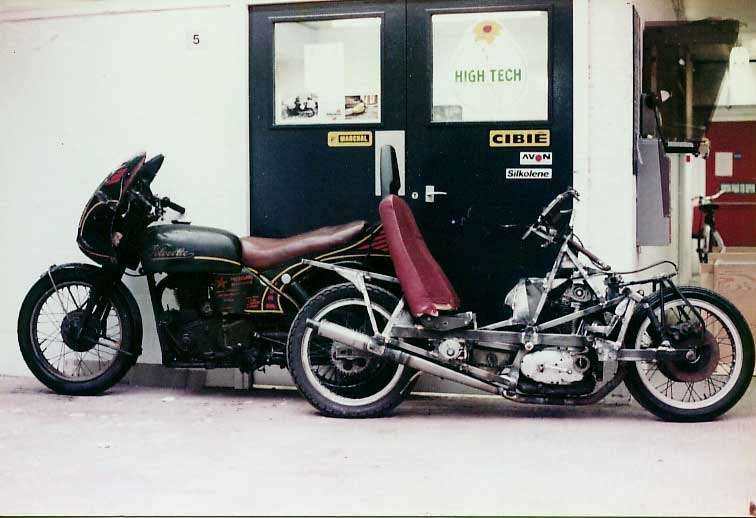 This picture shows rather clearly how much lower FF's are than motorcycles. The 500cc Velocette Venom is not a large motorcycle... The extreme simplicity of 001's chassis is also very clear.