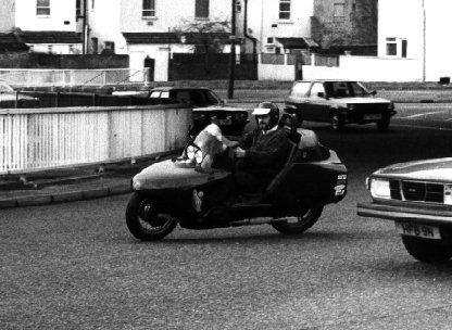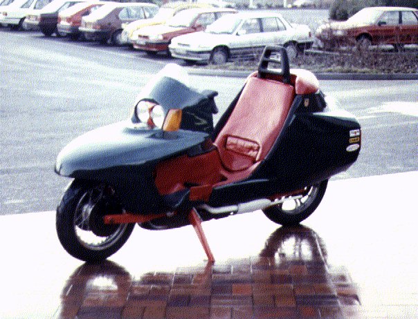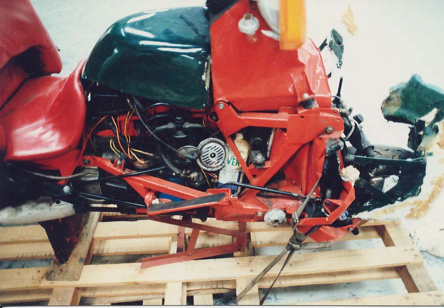 Here's 002 after recovery from the crash site. You can see how the front structure has crumpled very progressively and the foot plate has come back while still providing foot protection. More interestingly the 'conning tower' front mount, innediately below the indicator lens, has just started to collapse under the ompact of my body hitting the steering control. You can see also how the engine cover, a foam/GRP structure has been driven into the back of the conning tower by my body.