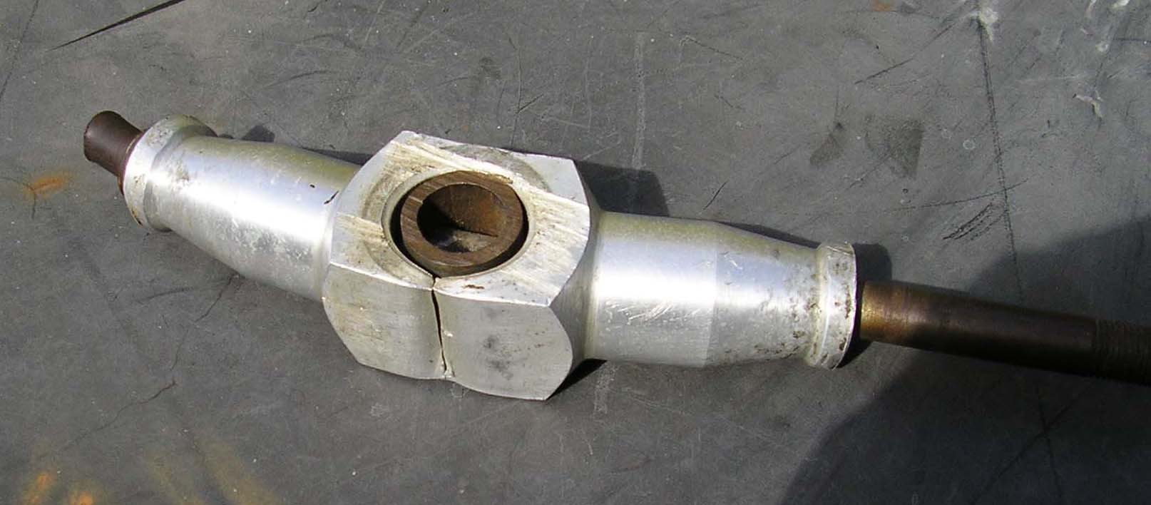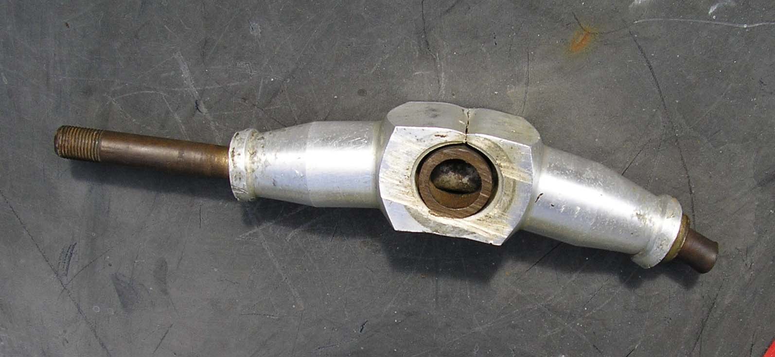 Another shot of the axle to show off the classic 'cup and cone' tensile fracture across the rear face. You can even see how the fracture started at the external corners, which have stretched less – a usefull demonstration to designers that even external corners are stress raisers. The axle would have fractured after the wheel had collapsed enough for the actual hub to hit the rear wheel of the car. You're looking at the result of absorbing a lot of energy!